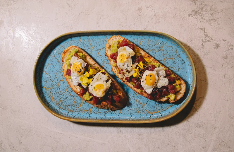 sobre pan de hogaza de Alfacar campeón de España*, guacamole, huevo de codorniz y sésamo. Pan “Fuente grande” de Miguel Caballero, pan ganador de la Estrella de la Panadería entre los 50 mejores panaderos de España